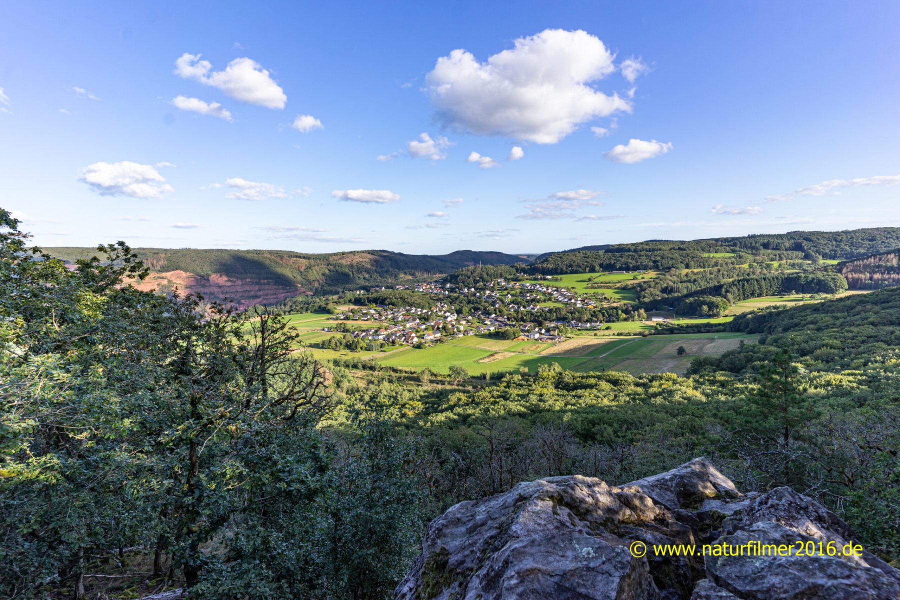 Vom „Weissenfels“ ist es nur noch ein leichter geschwungener Anstieg bis zum „Kreuzungsbereich Buchholz“. Hier folgt man dem horizontal durch den hohen Baumbestand verlaufenden Waldweg und zweigt an der nächsten Abbiegung nach rechts in den leicht abfallenden Weg ab. (An dieser Stelle verlässt man den Europäischen Fernwanderweg E3). Immer wieder kann man einen Blick auf den „Altfelsen“, eine imposante, hoch aufragende Sandsteinformation, werfen. Nach einer kurzen Wegstrecke wird ein wunderschöner Aussichtspunkt mit Blick auf das Kasteler Plateau, die Saarweingemeinde Serrig und das Saartal in Richtung Mosel erreicht.